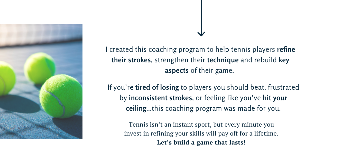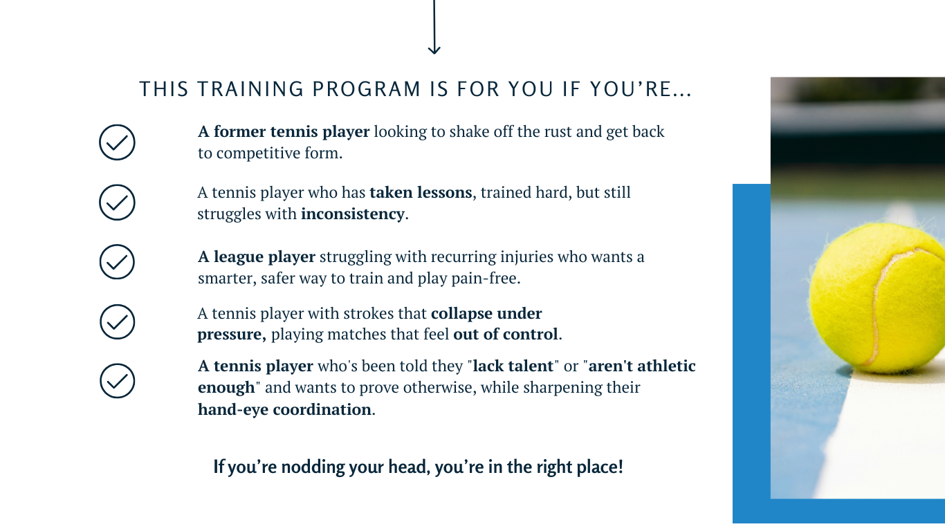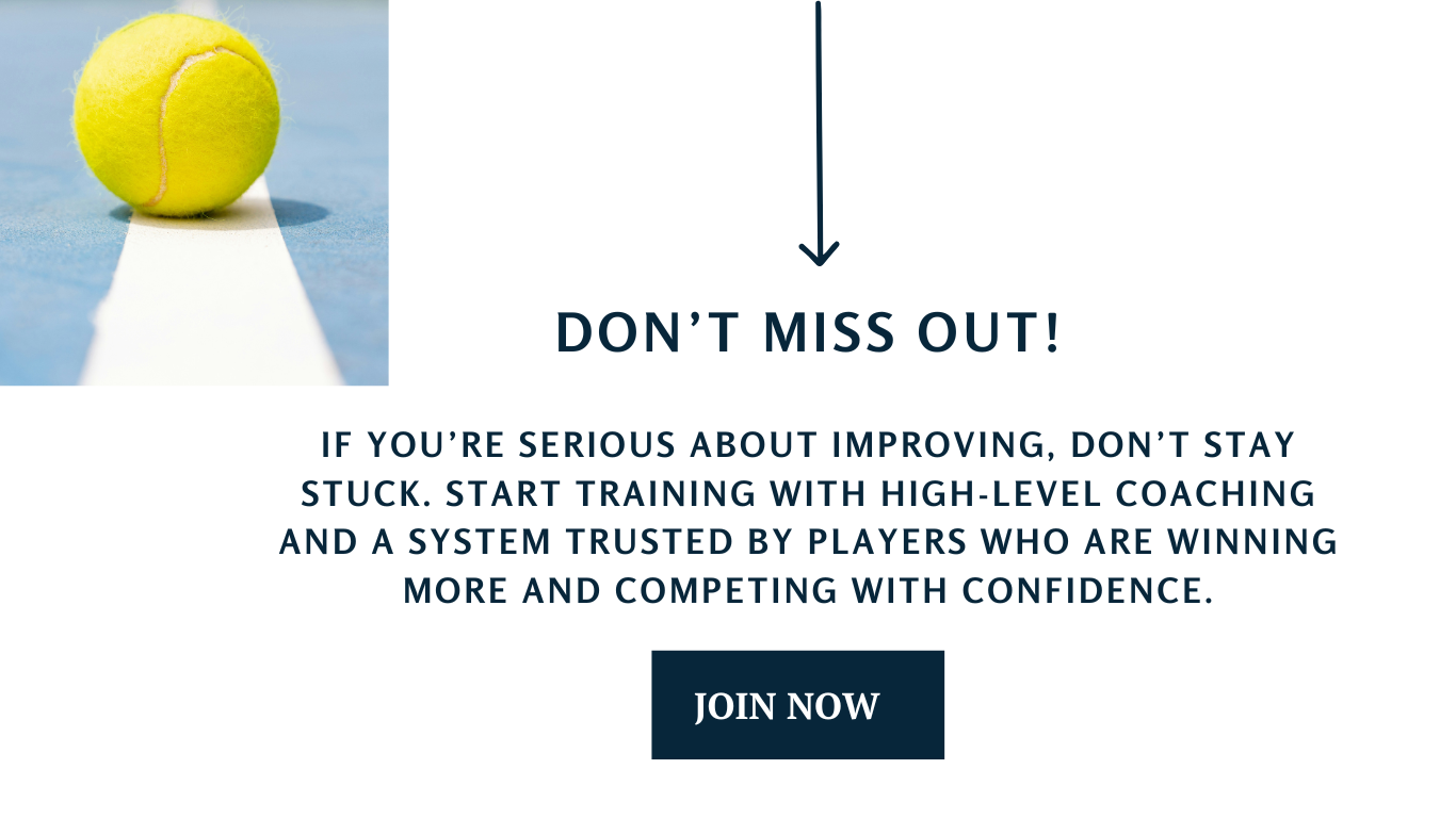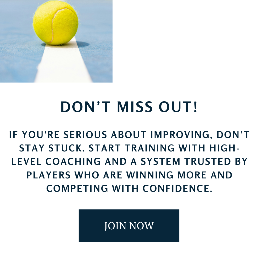 This isn’t just a set of lessons, it’s a complete coaching system. With on-demand training, monthly strategy calls, and ongoing support, you'll have everything you need to correct problem areas, prevent injuries, and compete with confidence every time you step on the court.