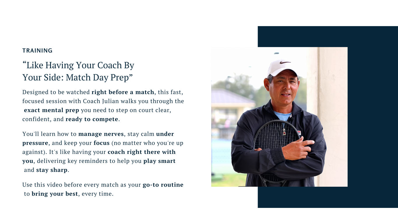 Designed to be watched right before a match, this fast, focused session with Coach Julian walks you through the exact mental prep you need to step on court clear, confident, and ready to compete.