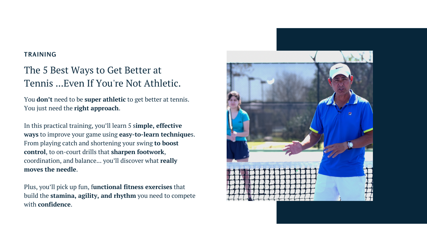 In this practical training, you’ll learn 5 simple, effective ways to improve your game using easy-to-learn techniques. From playing catch and shortening your swing to boost control, to on-court drills that sharpen footwork, coordination, and balance... you’ll discover what really moves the needle.