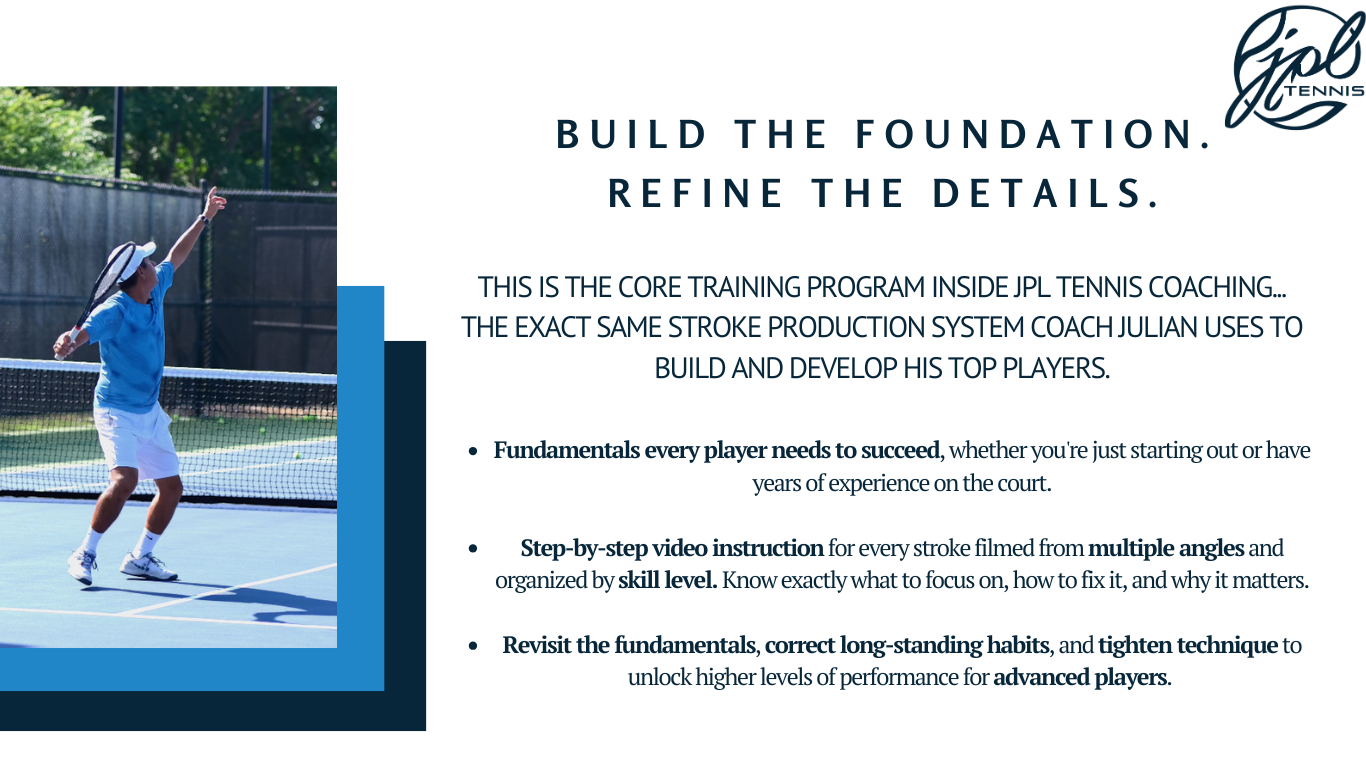 Your JPL Tennis Coaching membership includes full access to the entire library of training programs. As long as you're subscribed, you can revisit any lesson, anytime, at your own pace.